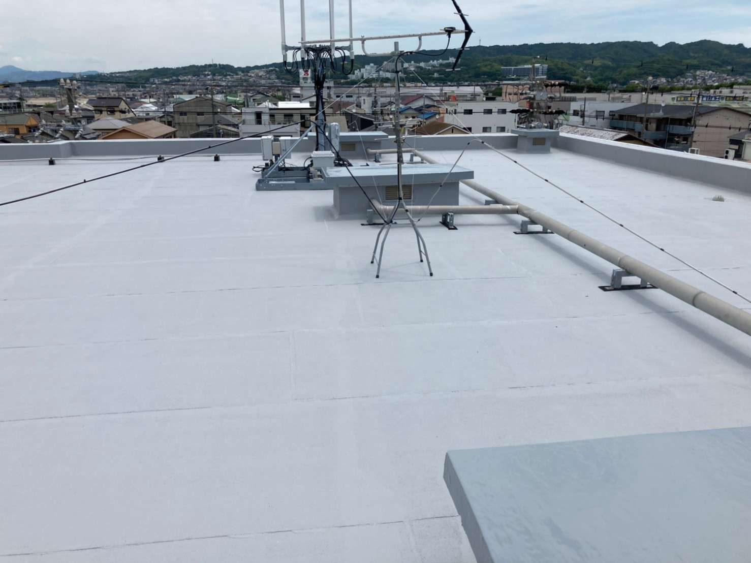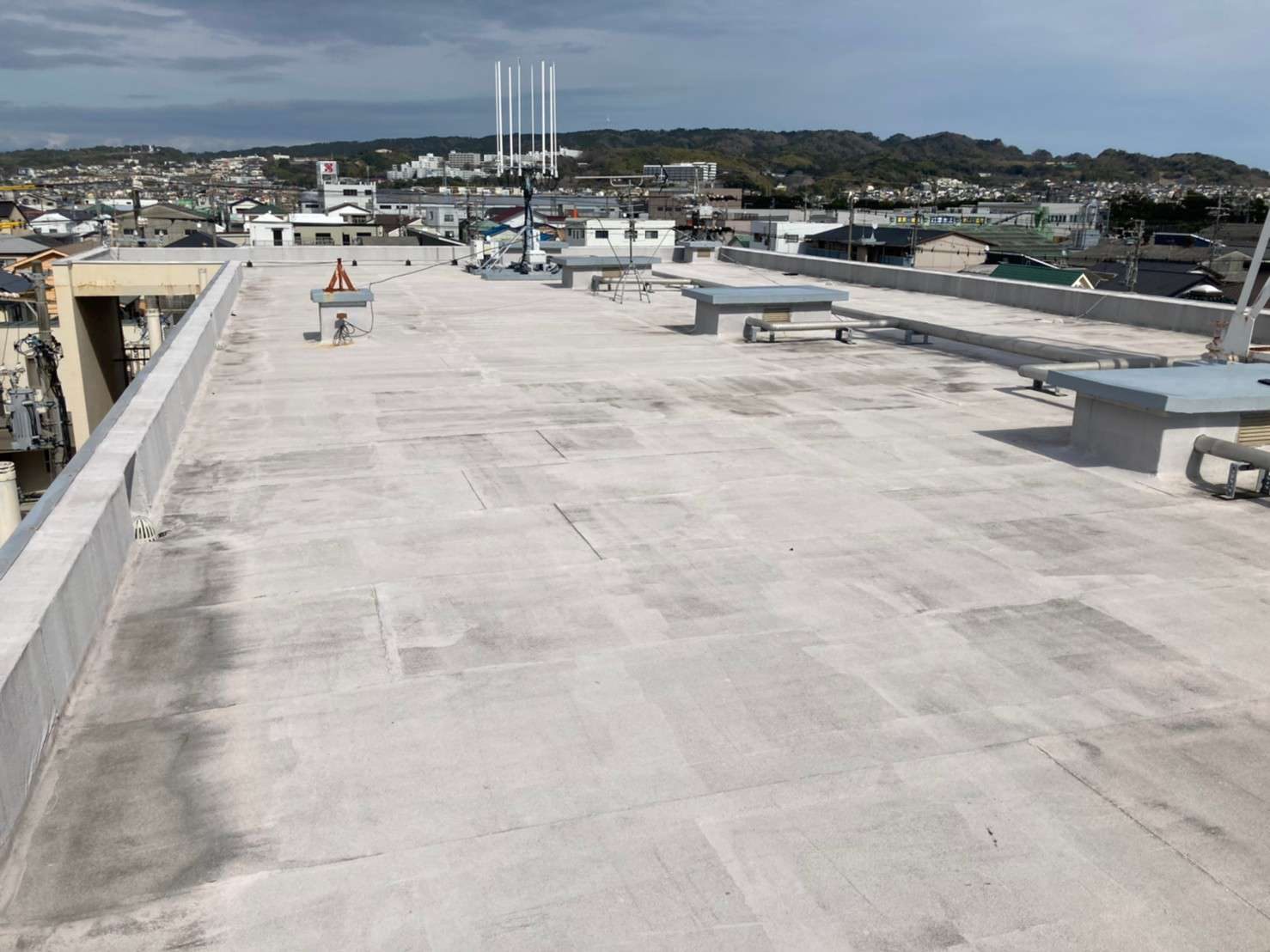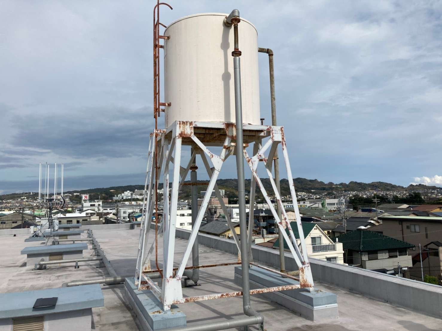 工事詳細 場所 静岡市駿河区 施工内容 屋上トップコート 高架水槽シリコン樹脂塗装 使用材料 トップコート:ルーフガード 高架水槽:クリーンマイルドシリコン 築年数 30年程度 期間 2週間 担当者からのコメント 経年劣化により床の塗膜面にヒビやチョーキングが確認でき このままにしておくと防水層も痛めてしまうので 今回トップコートを推奨いたしました。 高架水槽も錆ができてきているので ケレン後、錆止め塗装→シリコン樹脂塗装を施工しました。 高所作業だったので、塗料の飛散と落下などに注意し 作業を進めました。 施工前 施工後