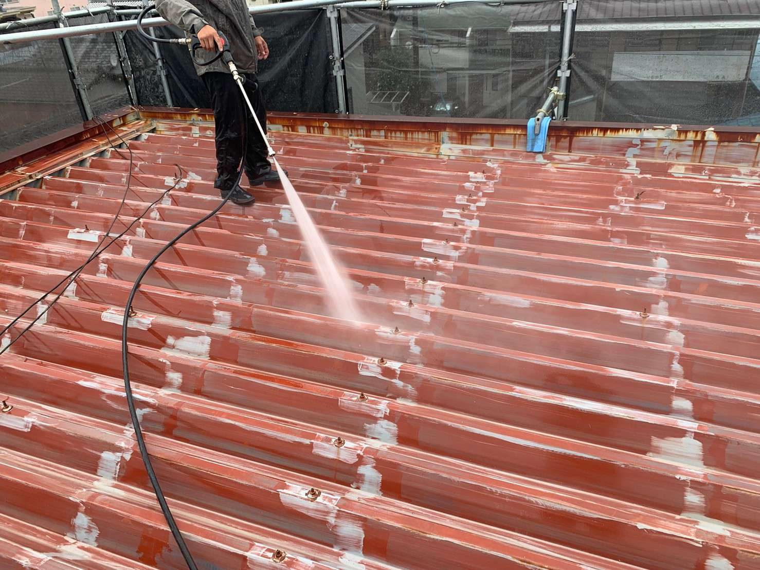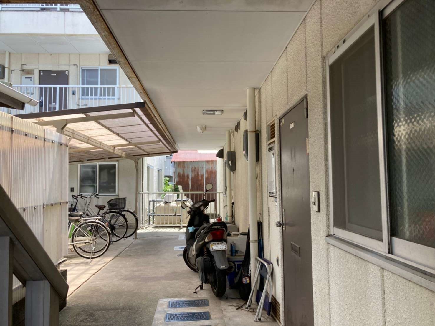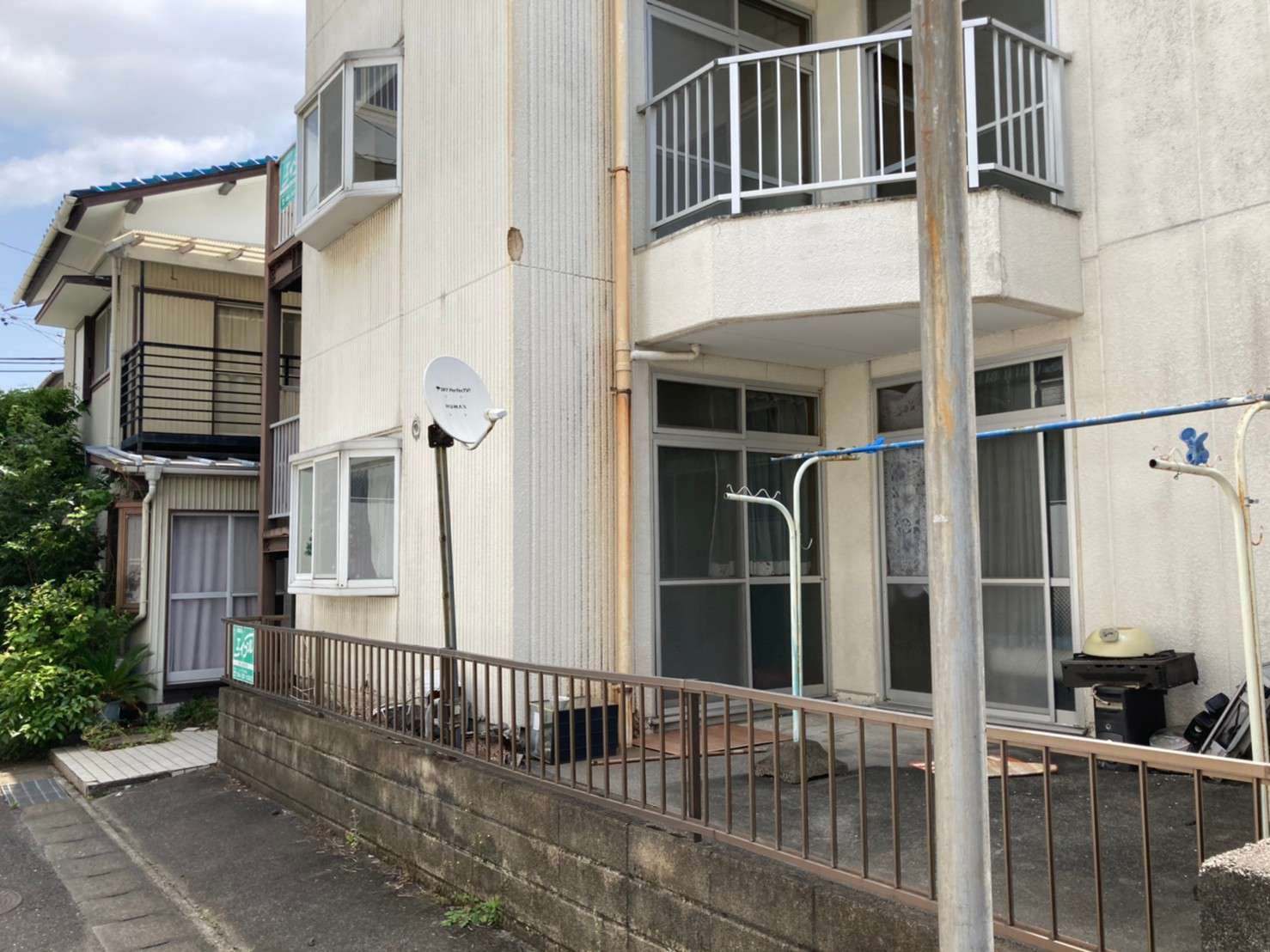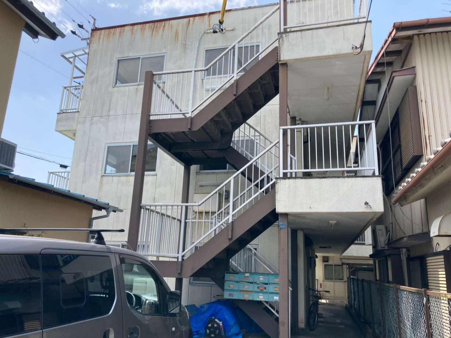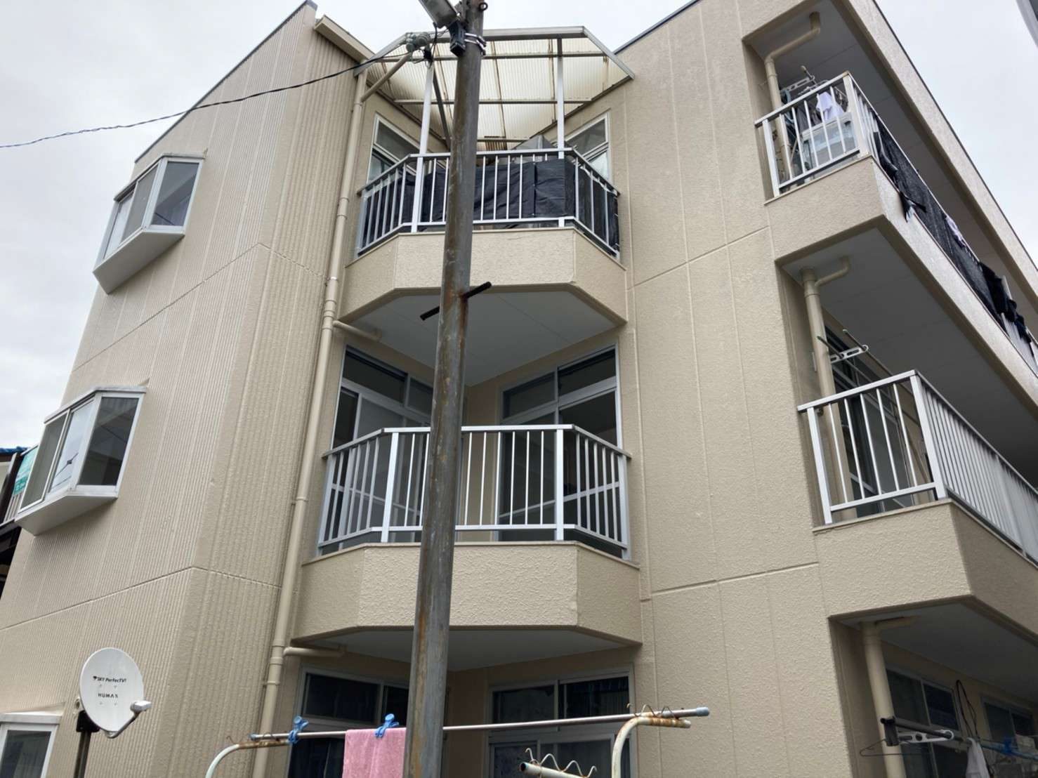 工事詳細 場所 静岡市清水区 施工内容 屋根.外壁シリコン樹脂塗装 バルコニー ウレタン防水 共用部 FRP修繕 トップコート 使用材料 屋根:ヤネフレッシュSi 外壁:水系ファインコートシリコン パーツ:クリーンマイルドシリコン 築年数 30年程度 期間 2021.10.中旬~2021.12上旬 1か月半 担当者からのコメント 外部に水栓・電源がなかった為、 入居者様にお願いしお借りしての作業となりました。 入居者様・近隣様に迷惑にならないよう、 音が出る作業(仮設工事)などは土日祝は避けて作業。 鋼製部(階段・樋吊り金具)がかなり傷んでおり、 板金補修をし塗装を行いました。 共用部階段廻りの勾配が悪く水たまりになってしまうため、 モルタルにて勾配をつけ排水ドレンをつけて 水がたまらないように施工しました。 駐輪場の屋根に足場が干渉してしまうのと 劣化もしていたので、交換工事も行いました。 施工前 施工中 施工後