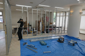 工事の内容 場所 焼津市 施工内容 多目的スペース改装工事 使用材料 軽量鉄骨 プラスターボード・長尺シート タイルカーペット・クロス 築年数 工事期間 2週間 壁の仕切りがない部屋に間仕切壁を増設し部屋をつくりました。 床はタイルカーペットと長尺シートで仕上げてあります。 クロスの貼替も行い部屋全体が明るくなりました。 施工前 施工中 施工後