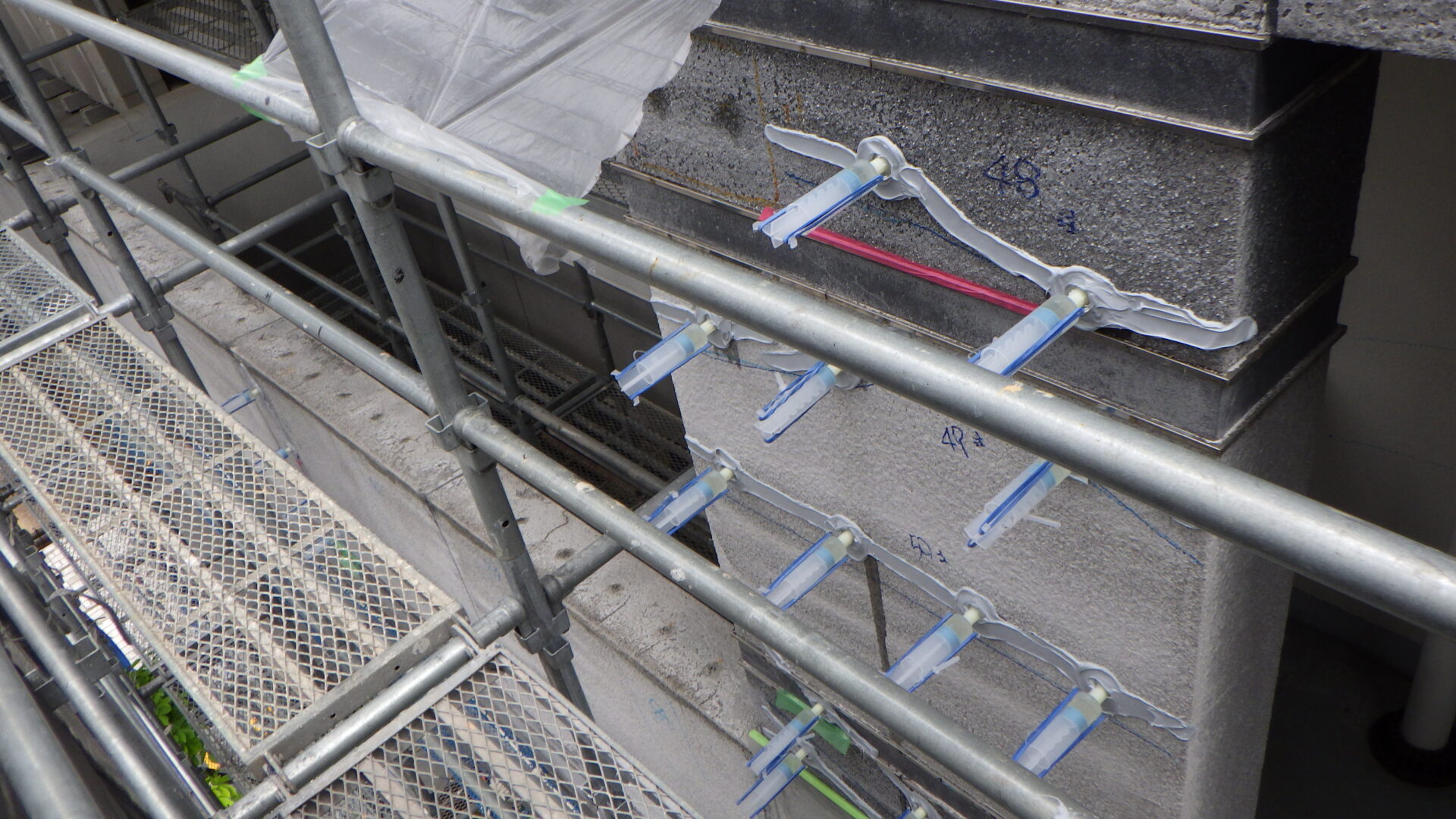 工事の内容 場所 静岡市駿河区 施工内容 打診調査 石調外壁塗装工事 使用材料 築年数 工事期間 約2カ月 人通りの多い場所で足場架け払いは特に気を使いました。 高圧洗浄は、予定をスライドさせ雨天時に行いました。 工程通りに工事完了しました。 施工前 施工中 施工後