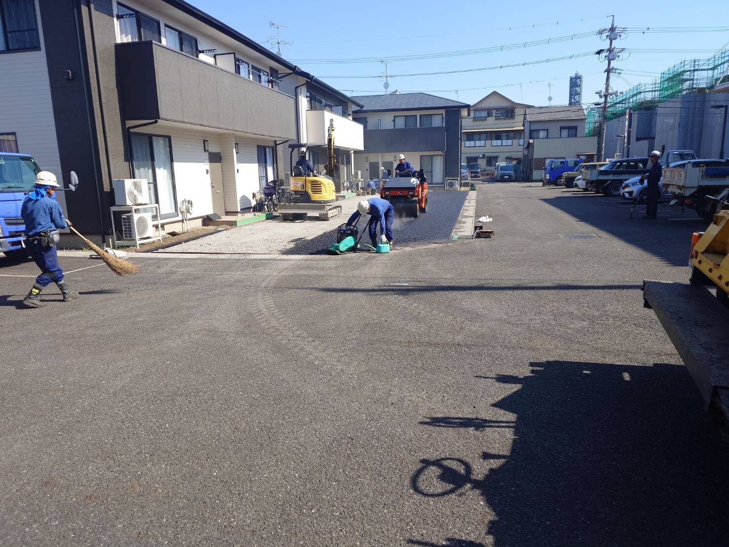 工事の内容 場所 静岡市駿河区 施工内容 アスファルト舗装駐車場工事 駐輪場サイドパネル設置 使用材料 築年数 工事期間 3日間 鋤取った土は、処分の金額を減らす為に敷地内の補修に使い、浸透性アスファルトで施工しました。 まだ、暑くないのでアスファルトの温度も早めに下がり予定通りに完了しました。 施工前 施工中 施工後