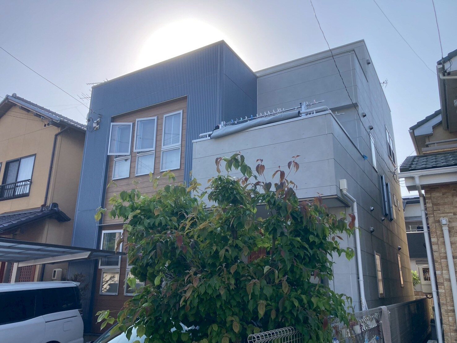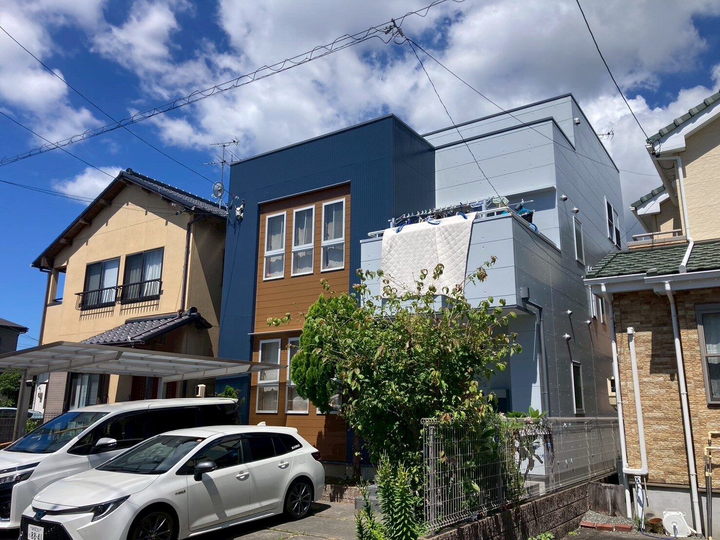 工事の内容 場所 静岡市清水区 施工内容 外部塗装工事 使用材料 屋根:SPパワールーフSi 外壁:SPパワーシリコン 築年数 20年 工事期間 1カ月 既存外壁下地が3パターンとなっており、 それにともない3色の色分けとなります。 大変おしゃれな仕上がりになりました。 高耐久の塗料を使用したので、耐久性も期待できます。 施工前 施工中 施工後